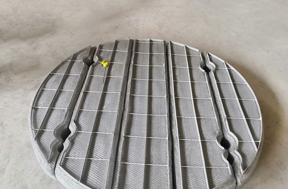絲網(wǎng)除沫器主要是由絲網(wǎng)、絲網(wǎng)格柵組成絲網(wǎng)塊和固定絲網(wǎng)塊的支承裝置構(gòu)成,絲網(wǎng)為各種材質(zhì)的氣液過濾網(wǎng),氣液過濾網(wǎng)是由金屬絲或非金屬絲組成。氣液過濾網(wǎng)的非金屬絲由多股非金屬纖維捻制而成,亦可為單股非金屬絲。該絲網(wǎng)除沫器不但能濾除懸浮于氣流中的較大液沫,而且能濾除較小和微小液沫,廣泛應(yīng)用于化工、石油、塔器制造、壓力容器等行業(yè)中的氣液分離裝置中。